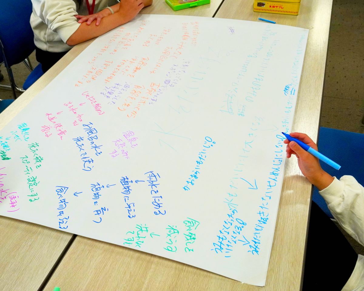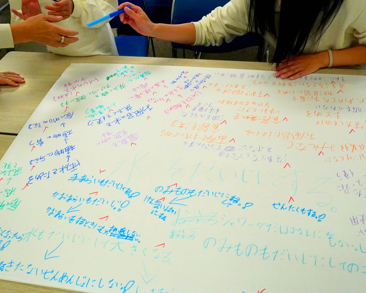 水を大切にするにはどうしたら良いか、そしてその水を大切にするとどのような良いことが生まれるか、等をみんなで書き出しました!
