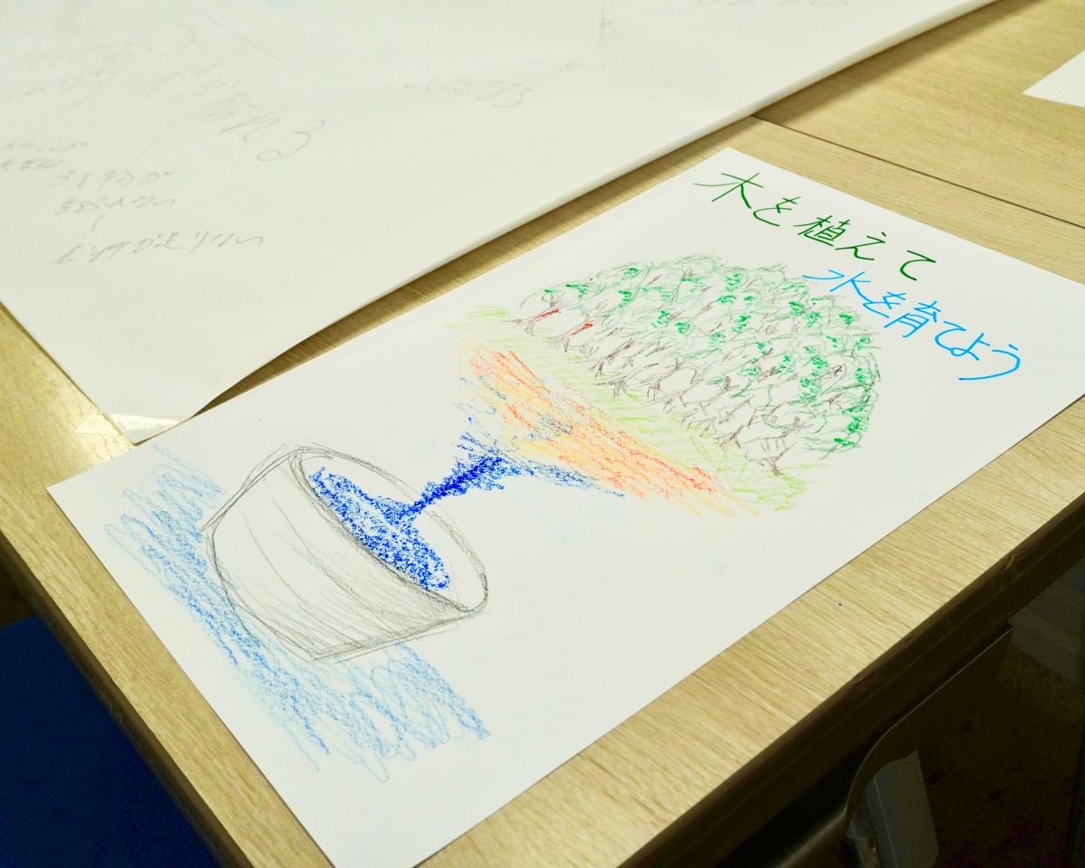 水をテーマに、自分たちの考えや感じたことを言葉にし、それを形にしていく過程は、決して簡単ではありませんでした。特にキャッチコピーを考える場面では、伝えたい想いを短い言葉に込める難しさを感じながらも、大人も子どもも一緒になって、何度もアイデアを出し合いました。